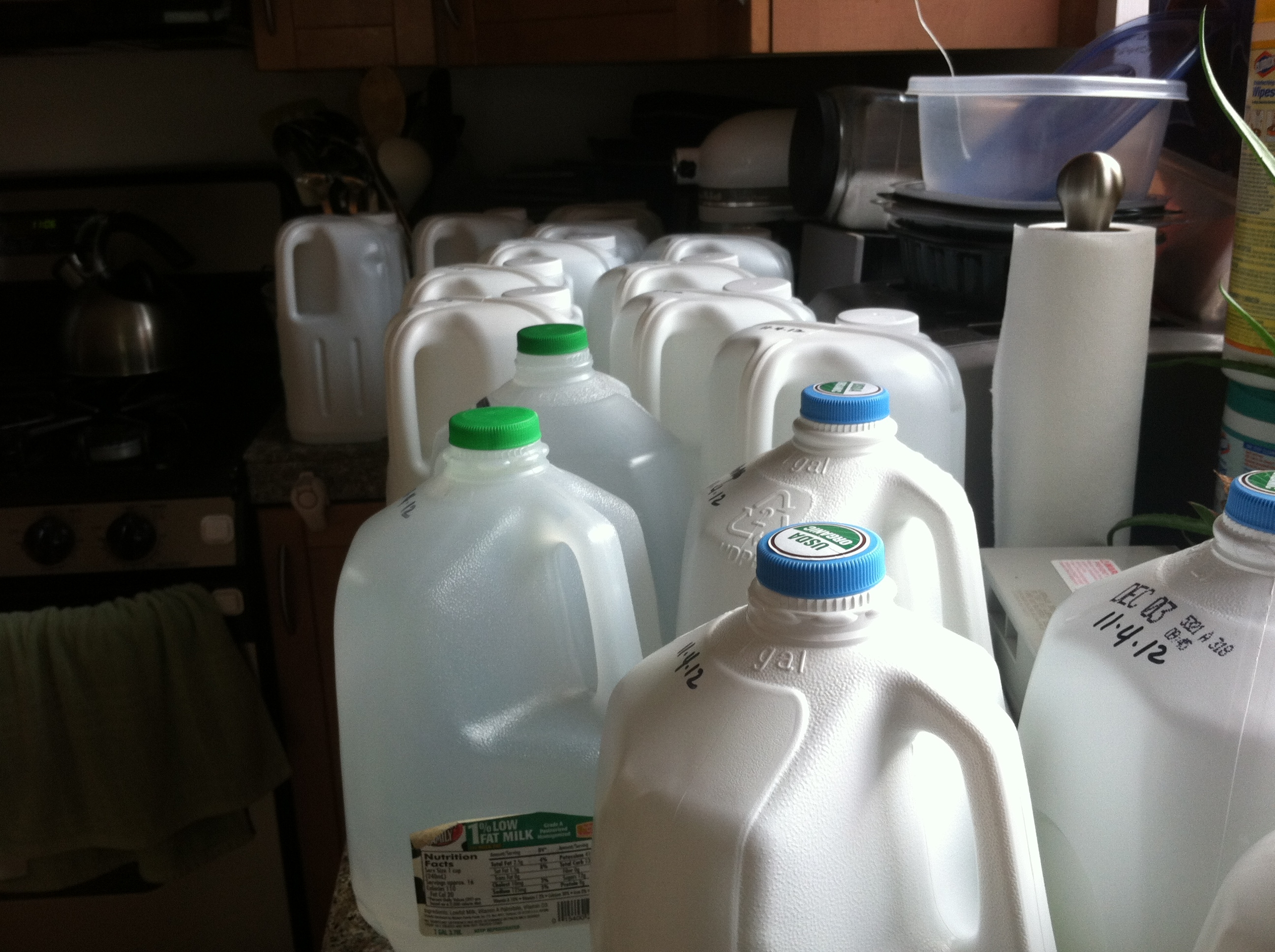 Although soda bottles are recommended, bleached and washed milk bottles such as the ones shown can be a great way to store your emergency supply of water. Notice how the bottles have been marked with the 11-4-12 fill date? It’s never too late to take another step toward preparedness. Let us know if you’ve checked your supply kits and refreshed your water!