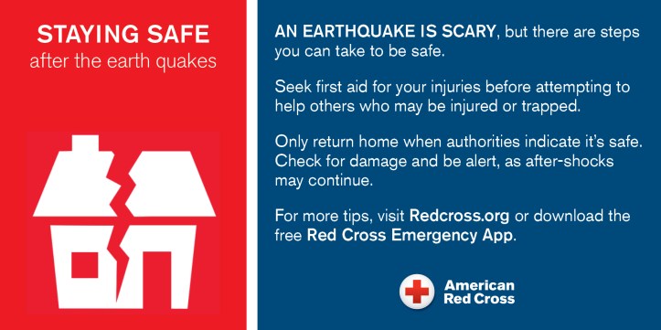 Finally, assume the quake will be followed by one or more aftershocks, as our recent quake was. You dropped, covered and held on during the first shock. Do exactly the same at each aftershock until the quake has run its course.