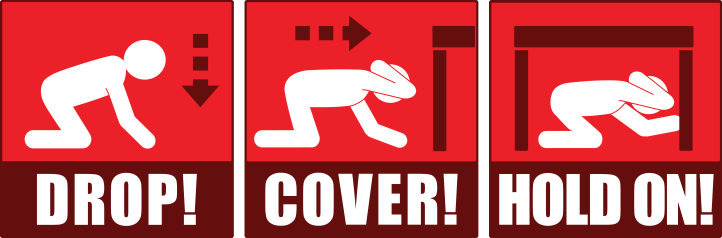 Next you should know how to how to stay safe during a quake. That’s where drop, cover and hold on comes into play. At the very first tremble, drop to your knees, crawl under a table or desk to protect yourself from falling objects, and hold on to something sturdy until the quake ends. If there is nothing to crawl under for cover, stay against an interior wall with no windows.