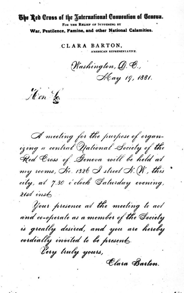The text reads as follows: “The Red Cross International Convention of Geneva. For the Relief of Suffering by War, Pestilence, Famine, and other Natural Calamities. Clara Barton, American Representative. Washington, D.C., May 19, 1881. A meeting for the purpose of organizing a central National Society of the Red Cross of Geneva will be held at my rooms, No. 1326 I Street N. W., this city, at 7.30 o’clock Saturday evening, 21th inst. Your presence at the meeting to act and co-operate as a member of this Society is greatly desired, and you are hereby cordially invited to be present. Very truly yours, Clara Barton.” American Red Cross Archive.