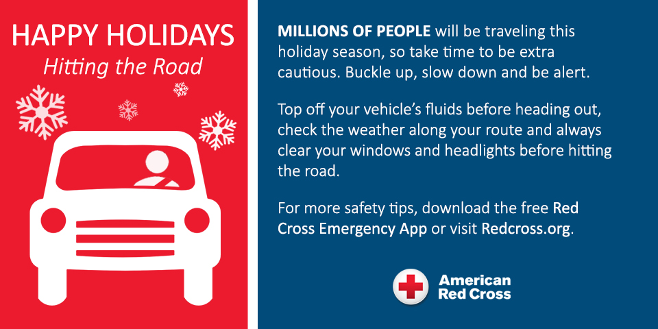 Finally, wherever you travel this holiday season, make sure everyone follows the Covid-19 safety rules: Wear a mask, maintain social distance, keep all gatherings small and do things outdoors when possible. Make sure you know — and follow — any and all pandemic rules in place at your destination. The American Red Cross wishes you a happy, healthy and safe holiday season!
