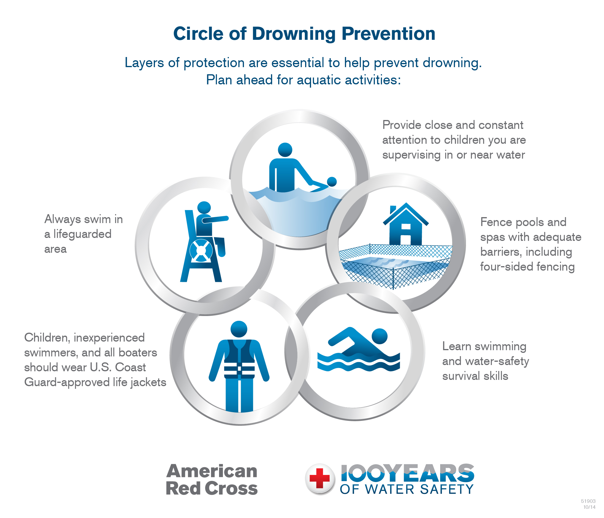 You help keep kids safe by implementing what the Red Cross calls the Circle of Drowning Prevention. Those are the steps you must take to reduce the risk of water death. That includes keeping a close watch on kids whenever and wherever they are in the water. It also includes such things as putting a fence or barrier around pools — high and secure enough to keep kids out. (Most child drownings occur during non-swim times, when children were not expected to be in water.)